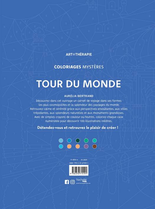 Découvrez dans cet ouvrage un carnet de voyage dans ses formes les plus cosmopolites et la splendeur des paysages du monde. Retrouvez calme et sérénité grâce aux perspectives envoûtantes, aux villes trépidantes, aux splendeurs naturelles et aux monuments grandioses. Avec de simples crayons de couleur ou feutres, coloriez chaque case numérotée pour découvrir 100 illustrations inédites.