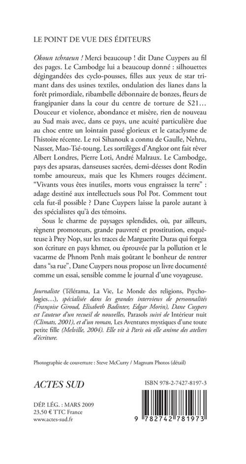 Okoun tchraeun ! Merci beaucoup ! dit Dane Cuypers au fil des pages. Le Cambodge lui a beaucoup donné : silhouettes dégingandées des cyclo-pousses, filles aux yeux de star trimant dans des usines textiles, ondulation des lianes dans la forêt primordiale, ribambelle débonnaire de bonzes, fleurs de frangipanier dans la cour du centre de torutre de S21... Douceur et violence, abondance et misère, rien de nouveau au Sud mais avec, dans ce pays, une acuité particulière due au choc entre un lointain passé glorieux et le cataclysme de l'histoire récente. Le roi Sihanouk a connu de Gaulle, Nehru, Nasser, Mao-Tsé-toung. Les sortilèges d'Angkor ont fait rêver Albert Londres, Pierre Loti, André Malraux. Le Cambodge, pays des apsaras, danseuses sacrées, demi-déesses dont Rodin tombe amoureux, mais que les Khmers rouges déciment. "Vivants vous êtes inutiles, morts vous engraissez la terre" : adage destiné aux intellectuels sous Pol Pot. Comment tout cela fut-il possible? Dane Cuypers laisse la parole autant à des spécialistes qu'à des témoins. Sous le charme de paysages splendides, où, par ailleurs, règnent promoteurs, grande pauvreté et prostitution, enquêteuse à Prey Nop, sur les traces de Marguerite Duras qui forgea son écriture en pays khmer, ou éprouvée par la pollution et le vacarme de Phnom Penh mais goûtant le bonheur de rentrer dans "sa rue", Dane Cuypers nous propose un livre documenté comme un essai, sensible comme le journal d'une voyageuse.