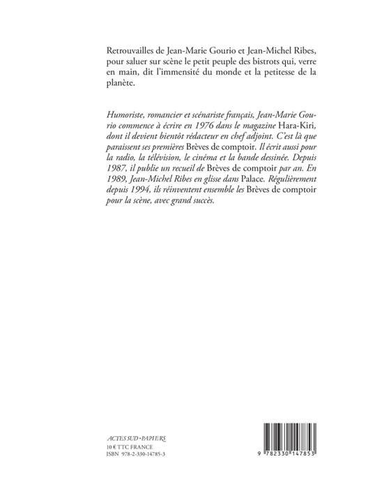 Retrouvailles de Jean-Marie Gourio et Jean-Michel Ribes, pour saluer sur scène le petit peuple des bistrots qui, verre en main, dit l'immensité du monde et la petitesse de la planète. Un irrésistible opéra parlé.