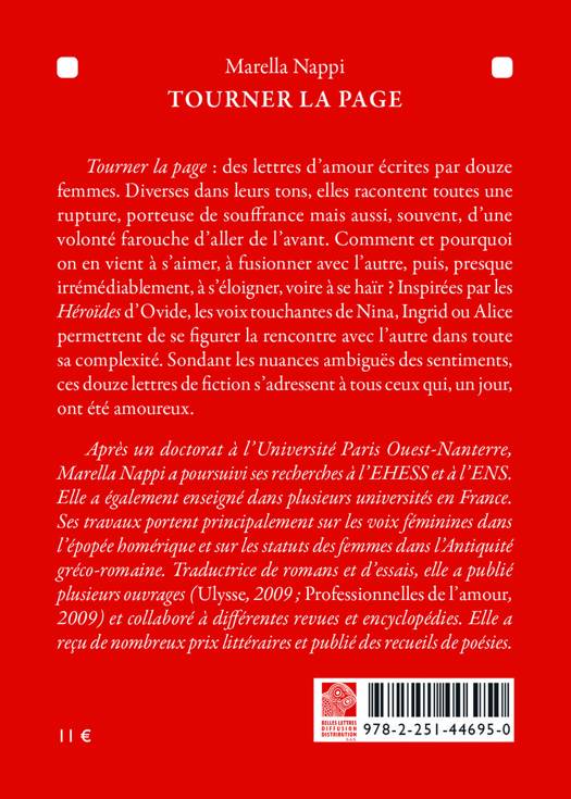 Tourner la page des lettres d'amour ecrites par douze femmes. Diverses dans leurs tons, elles racontent toutes une rupture, porteuse de souffrance mais aussi, souvent, d'une volonte farouche d'aller de l'avant. Comment et pourquoi on en vient a s'aimer, a fusionner avec l'autre, puis, presque irremediablement, a s'eloigner, voire a se hair ? Inspirees par les Heroides d'Ovide, les voix touchantes de Nina, Ingrid ou Alice permettent de se figurer la rencontre avec l'autre dans toute sa complexite. Sondant les nuances ambigues des sentiments, ces douze lettres de fiction s'adressent a tous ceux qui, un jour, ont ete amoureux.