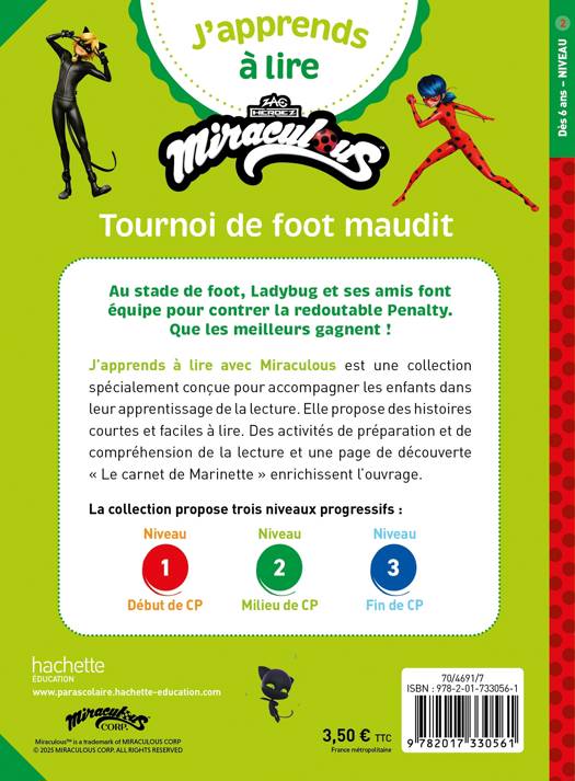 Au stade de foot, Ladybug et ses amis font équipe pour contrer la redoutable Penalty. Que les meilleurs gagnent ! J’apprends à lire avec Miraculous est une collection spécialement conçue pour accompagner les enfants dans leur apprentissage de la lecture. Elle propose des histoires courtes et faciles à lire. Des activités de préparation et de compréhension de la lecture et une page de découverte « Le carnet de Marinette » enrichissent l’ouvrage.
