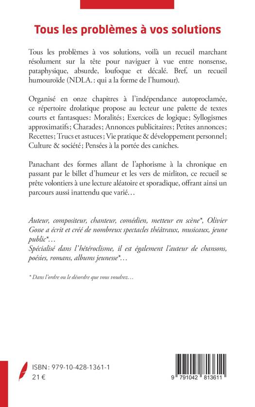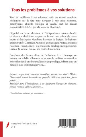 Tous les problèmes à vos solutions, voilà un recueil marchant résolument sur la tête pour naviguer à vue entre nonsense, pataphysique, absurde, loufoque et décalé. Bref, un recueil humouroïde (NDLA. qui a la forme de l'humour). Organisé en onze chapitres à l'indépendance autoproclamée, ce répertoire drolatique propose au lecteur une palette de textes courts et fantasques Moralités; Exercices de logique; Syllogismes approximatifs; Charades; Annonces publicitaires; Petites annonces; Recettes; Trucs et astuces; Vie pratique & développement personnel; Culture & société; Pensées à la portée des caniches. Panachant des formes allant de l'aphorisme à la chronique en passant par le billet d'humeur et les vers de mirliton, ce recueil se prête volontiers à une lecture aléatoire et sporadique, offrant ainsi un parcours aussi inattendu que varié...
