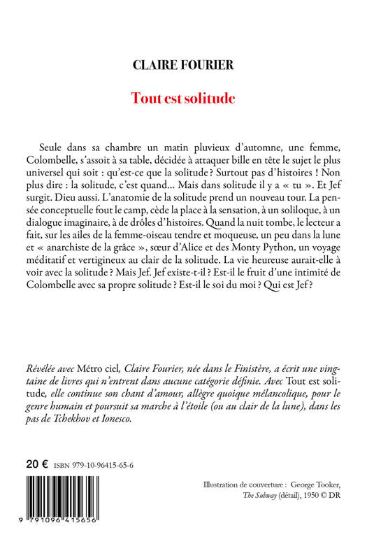 Seule dans sa chambre un matin pluvieux d’automne, une femme, Colombelle, s’assoit à sa table, décidée à attaquer bille en tête le sujet le plus universel qui soit : qu’est-ce que la solitudeâ? Surtout pas d’histoires ! Non plus dire : la solitude, c’est quand... Mais dans solitude il y a “tu”. Et Jef surgit. Dieu aussi. L’anatomie de la solitude prend un nouveau tour. La pensée conceptuelle fout le camp, cède la place à la sensation, à un soliloque, à un dialogue imaginaire, à de drôles d’histoires. Quand la nuit tombe, le lecteur a fait, sur les ailes de la femme-oiseau tendre et moqueuse, un peu dans la lune et “anarchiste de la grâce”, soeur d’Alice et des Monty Python, un voyage méditatif et vertigineux au clair de la solitude. La vie heureuse aurait-elle à voir avec la solitudeâ? Mais Jef. Jef existe-t-ilâ? Est-il le fruit d’une intimité de Colombelle avec sa propre solitudeâ? Est-il le soi du moiâ? Qui est Jefâ?