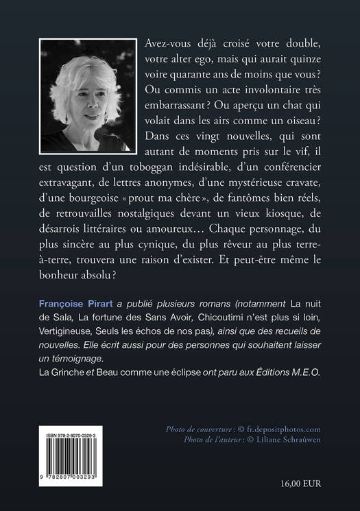 Avez-vous déjà croisé votre double, votre alter ego, mais qui aurait quinze voire quarante ans de moins que vous ? Ou commis un acte involontaire très embarrassant ? Ou aperçu un chat qui volait dans les airs comme un oiseau ? Dans ces vingt nouvelles, qui sont autant de moments pris sur le vif, il est question d’un toboggan indésirable, d’un conférencier extravagant, de lettres anonymes, d’une mystérieuse cravate, d’une bourgeoise « prout ma chère », de fantômes bien réels, de retrouvailles nostalgiques devant un vieux kiosque, de désarrois littéraires ou amoureux... Chaque personnage, du plus sincère au plus cynique, du plus rêveur au plus terre-à-terre, trouvera une raison d’exister. Et peut-être même le bonheur absolu ?<br /> Françoise Pirart a publié plusieurs romans (notamment La nuit de Sala, La fortune des Sans Avoir, Chicoutimi n’est plus si loin, Vertigineuse, Seuls les échos de nos pas), ainsi que des recueils de nouvelles. Elle est titulaire de plusieurs prix littéraires. Elle a été enseignante, et écrit aussi pour des personnes qui souhaitent laisser un témoignage.
