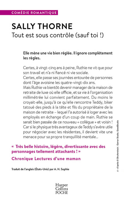Certes, à vingt-cinq ans à peine, Ruthie ne vit que pour son travail et n’a ni fiancé ni vie sociale.Certes, elle passe ses journées entourée de personnes dont l’âge avoisine les quatre-vingt-dix ans.Mais Ruthie va bientôt devenir manager du village pour seniors de luxe où elle officie, et sa vie lui convient parfaitement. Son emploi du temps est calé sur des semaines, ses journées sont millimétrées, et elle sait que tout est sous contrôle. Du moins le croyait-elle, jusqu’à ce qu’elle rencontre Teddy. Ce biker tatoué des pieds à la tête a besoin d’un toit, et son père, le propriétaire des lieux, lui permet de loger avec les employés à condition qu’il donne un coup de main. Ruthie se serait bien passée de cet élément perturbateur qui, du jour au lendemain, devient à la fois son « collègue » et son voisin. D’autant que, si le physique très avantageux de Teddy s’avère utile pour négocier avec les résidentes, il devient vite une menace pour sa propre tranquillité mentale…