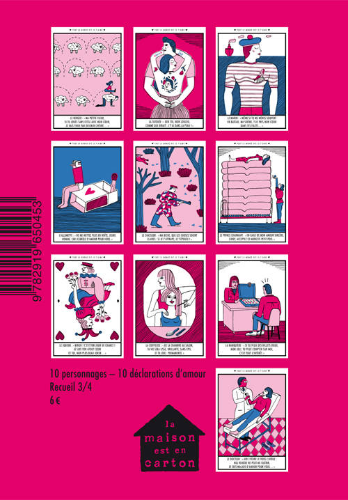 10 déclarations de 10 personnages : le berger, la tatouée, le marin, l’allumette, le chasseur, le prince charmant, le joueur, la coiffeuse, la banquière et le docteur.