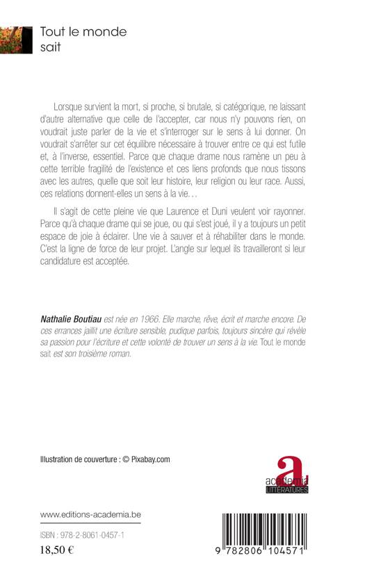 Tout le monde sait évoque les guerres anciennes et contemporaines vues à travers le regard préservé de deux jeunes étudiants en journalisme. Il est question ici de mémoire et de traces physiques, matérielles, psychologiques qui éclairent qui nous sommes. Le texte, qui s'articule autour de plusieurs voyages, est ponctué de lettres adressées à une enfant de la guerre dans un style qui mêle souvenirs flous, métaphores et allégories.