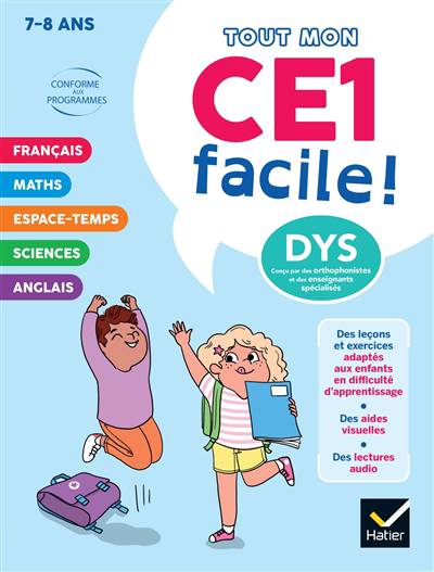 Toutes les matières du CE1 dans un ouvrage spécialement conçu pour les enfants dyslexiques ou en difficulté d'apprentissage par des orthophonistes et des enseignants spécialisés.