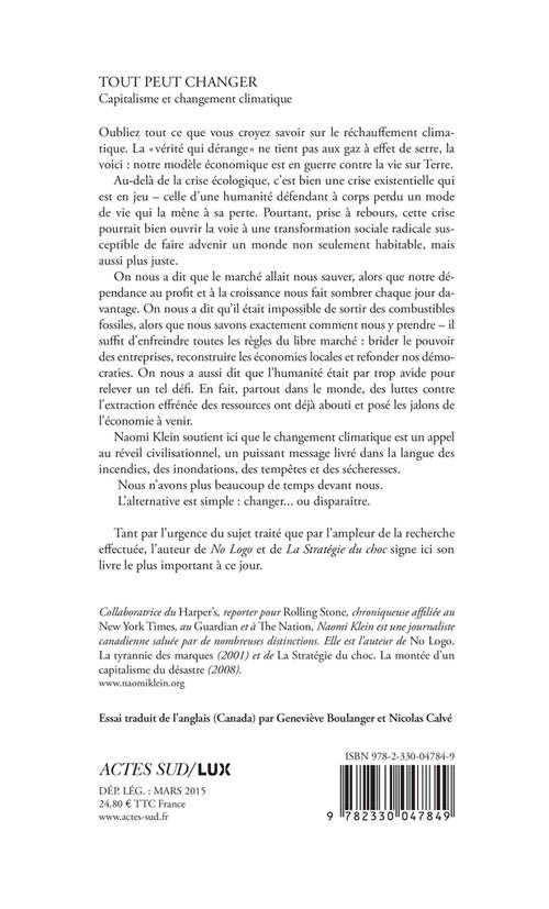 On nous a dit que le marché allait nous sauver, alors que notre dépendance au profit et à la croissance nous fait sombrer chaque jour davantage. On nous a dit qu'il était impossible de sortir des combustibles fossiles, alors que nous savons exactement comment nous y prendre - il suffit d'enfreindre toutes les règles du libre marché : brider le pouvoir des entreprises, reconstruire les économies locales et refonder nos démocraties. On nous a aussi dit que l'humanité était par trop avide pour relever un tel défi. En fait, partout dans le monde, des luttes contre l'extraction effrénée des ressources ont déjà abouti et posé les jalons de l'économie à venir.