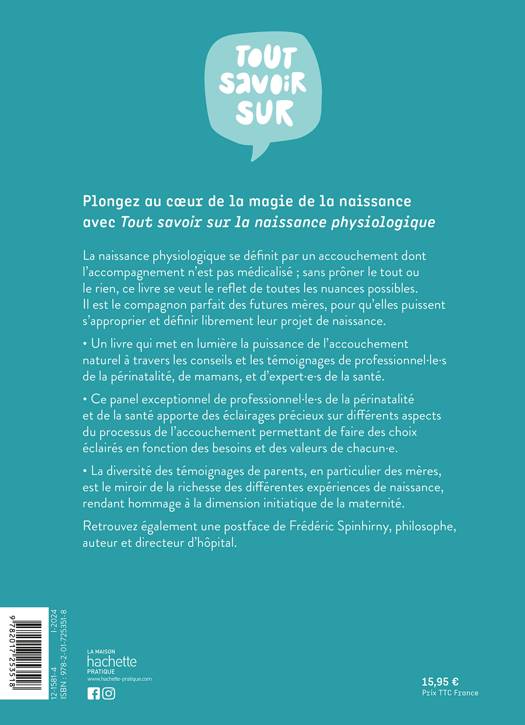 La naissance physiologique se définit par un accouchement dont l’accompagnement n’est pas médicalisé; sans prôner le tout ou le rien, ce livre se veut le reflet de toutes les nuances possibles. Il est le compagnon parfait des futures mères, pour qu’elles puissent s’approprier et définir librement leur projet de naissance. - Un livre qui met en lumière la puissance de l’accouchement naturel à travers les conseils et les témoignages de professionnelles de la périnatalité, de mamans, et d’expert-es de la santé. - Ce panel exceptionnel de professionnelles de la périnatalité et de la santé apporte des éclairages précieux sur différents aspects du processus de l’accouchement permettant de faire des choix éclairés en fonction des besoins et des valeurs de chacune. - La diversité des témoignages de parents, en particulier des mères, est le miroir de la richesse des différentes expériences de naissance, rendant hommage à la dimension initiatique de la maternité. Retrouvez également une postface de Frédéric Spinhirny, philosophe, auteur et directeur d’hôpital.