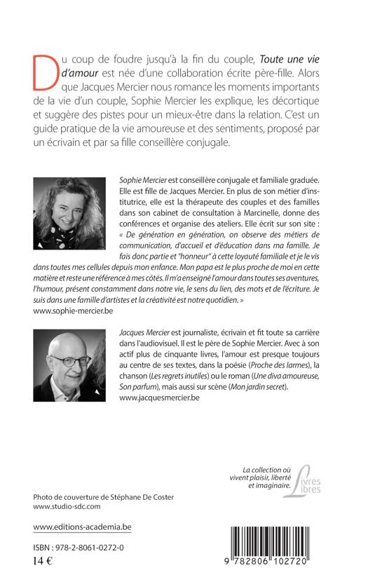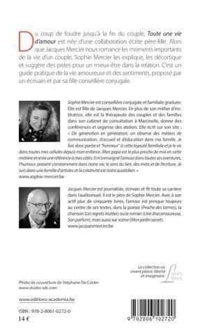 Du coup de foudre jusqu'à la fin du couple, Toute une vie d'amour est née d'une collaboration écrite pèrefille. Alors que Jacques Mercier nous romance les moments importants de la vie d'un couple, Sophie Mercier les explique, les décortique et suggère des pistes pour un mieux-être dans la relation. C'est un guide pratique de la vie amoureuse et des sentiments, proposé par un écrivain et par sa fille conseillère conjugale.