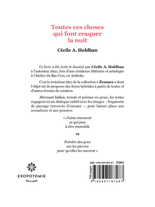 Ce livre a été écrit et dessiné par Cécile A. Holdban à l’automne 2021, lors d’une résidence littéraire et artistique à l’Atelier du Bas Cros, en Ardèche. C’est le troisième titre de la collection « Écumes » dont l’objet est de proposer des livres hybrides à partir de textes et d’autres formes de création. Alternant haïkus, tercets et poèmes en prose, les textes engagent ici un dialogue subtil avec les images – fragments de paysage traversés d’oiseaux –, pour laisser place aux sensations et aux pensées.