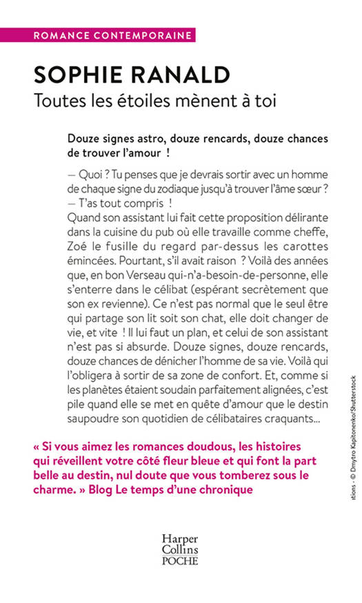 — Quoi ? Tu penses que je devrais sortir avec un homme de chaque signe du zodiaque jusqu’à trouver l'âme sœur ? — T’as tout compris ! Quand son assistant lui fait cette proposition délirante dans la cuisine du pub où elle travaille comme cheffe, Zoé le fusille du regard par-dessus les carottes émincées. Pourtant, s’il avait raison ? Voilà des années que, en bon Verseau qui-n’a-besoin-de-personne, elle s’enterre dans le célibat (espérant secrètement que son ex revienne). Ce n’est pas normal que le seul être qui partage son lit soit son chat, elle doit changer de vie, et vite ! Il lui faut un plan, et celui de son assistant n’est pas si absurde. Douze signes, douze rencards, douze chances de dénicher l’homme de sa vie. Voilà qui l’obligera à sortir de sa zone de confort. Et, comme si les planètes étaient soudain parfaitement alignées, c’est pile quand elle se met en quête d’amour que le destin saupoudre son quotidien de célibataires craquants…