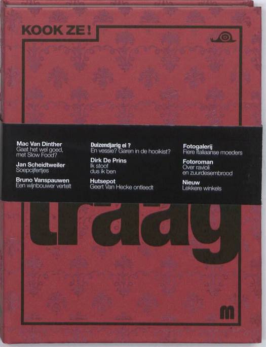 In dit vijfde nummer van het Bookazine KOOK ZE! is het thema TRAAG. Wat komt er in traag? - 40 gerechten : de klassiekers onder pruttelgerechten: coq au vin,cassoulet, tête de veau, stew en stoofvlees, maar ook gastronomie en de langzaamgaar technieken. - De ontleding van onze 'hutsepot' en de business achter 'soepen en bouillons' - Een historisch verhaal over stoverijen door Dirk De Prins (Culinair Ambiance) - Alles over rijpen : drogen, confijten, marineren, kaas en vlees en de top10 van de traagst groeiende ingrediënten. - Een stap voor stap beeldverhaal hoe je zuurdesembrood, verse ravioli's en bladerdeeg moet maken - Mac Van Dinther (De Volkskrant) brengt een kritisch verhaal over SlowFood - en natuurlijk ook de portret galerijen