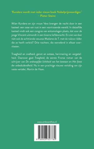 Traagheid en snelheid, genot en extase, herinnering en vergetelheid. Daarover gaat Traagheid van Milan Kundera, de eerste Franse roman van de schrijver van De ondraaglijke lichtheid van het bestaan en Het feest der onbeduidendheid. Nu in een prachtige nieuwe vertaling van zijn vaste vertaler, Martin de Haan. In Traagheid brengen Milan Kundera en zijn vrouw Vera de nacht door in een kasteel: een oase van rust in een voortrazende wereld. In datzelfde kasteel vindt ook een congres van insectologen plaats, dat voor de jonge Vincent uitmondt in een bizarre liefdesnacht. En zien we daar niet ook de achttiende-eeuwse Madame de T*** met de naïeve chevalier die ze heeft verleid? Drie nachten, die wervelend in elkaar overvloeien.