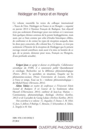 Ce volume rassemble les textes du colloque international « Traces de l'être. Heidegger en France et en Hongrie », organisé à l'Institut Français de Budapest. Ce n'est pas seulement à l'histoire de la réception de Heidegger que le présent ouvrage entend contribuer, mais aussi à la mise en lumière de ce qui, de sa pensée, demeure pour nous, Français ou Hongrois, d'une profonde actualité.