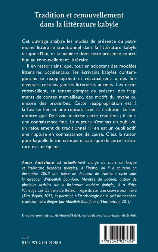 Cet ouvrage analyse les modes de présence du patrimoine littéraire traditionnel dans la littérature kabyle d'aujourd'hui et la manière dont cette présence contribue au renouvellement littéraire. Ainsi, tout en adoptant des modèles littéraires occidentaux, les écrivains kabyles contemporains se réapproprient et réactualisent certains genres littéraires anciens comme des contes merveilleux, des motifs du mythe ou encore des proverbes.
