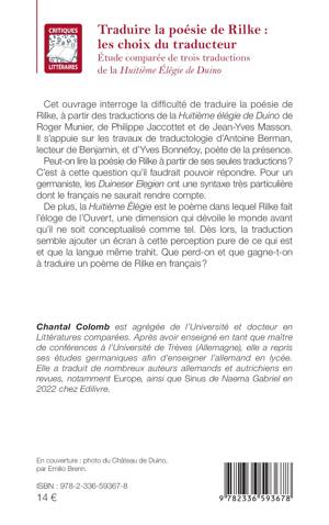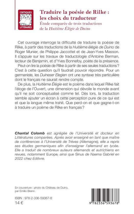 Cet ouvrage interroge la difficulté de traduire la poésie de Rilke, à partir des traductions de la Huitième élégie de Duino de Roger Munier, de Philippe Jaccottet et de Jean-Yves Masson. Il s'appuie sur les travaux de traductologie d'Antoine Berman, lecteur de Benjamin, et d'Yves Bonnefoy, poète de la présence. Peut-on lire la poésie de Rilke à partir de ses seules traductions ? C'est à cette question qu'il faudrait pouvoir répondre. Pour un germaniste, les Duineser Elegien ont une syntaxe très particulière dont le français ne saurait rendre compte. De plus, la Huitième Élégie est le poème dans lequel Rilke fait l'éloge de l'Ouvert, une dimension qui dévoile le monde avant qu'il ne soit conceptualisé comme tel. Dès lors, la traduction semble ajouter un écran à cette perception pure de ce qui est et que la langue même trahit. Que perd-on et que gagne-t-on à traduire un poème de Rilke en français ?
