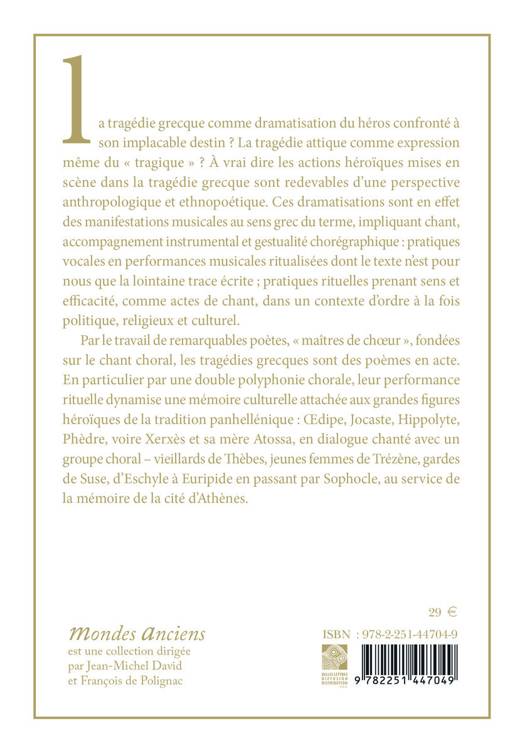 La tragedie grecque comme dramatisation du heros confronte a son implacable destin ? La tragedie attique comme expression meme du tragique ? A vrai dire les actions heroiques mises en scene dans la tragedie grecque sont redevables d'une perspective anthropologique et ethnopoetique. Ces dramatisations sont en effet des manifestations musicales au sens grec du terme, impliquant chant, accompagnement instrumental et gestualite choregraphique: pratiques vocales en performances musicales ritualisees dont le texte n'est pour nous que la lointaine trace ecrite; pratiques rituelles prenant sens et efficacite, comme actes de chant, dans un contexte d'ordre a la fois politique, religieux et culturel. Par le travail de remarquables poetes, maitres de choeur, fondees sur le chant choral, les tragedies grecques sont des poemes en acte. En particulier par une double polyphonie chorale, leur performance rituelle dynamise une memoire culturelle attachee aux grandes figures heroiques de la tradition panhellenique: OEdipe, Jocaste, Hippolyte, Phedre, voire Xerxes et sa mere Atossa, en dialogue chante avec un groupe choral - vieillards de Thebes, jeunes femmes de Trezene, gardes de Suse, d'Eschyle a Euripide en passant par Sophocle, au service de la memoire de la cite d'Athenes.