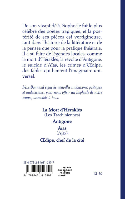 Ce premier volume du théâtre complet de Sophocle présente les quatre pièces les plus anciennes du dramaturge grec : La Mort d’Héraklès (Les Trachiniennes), Antigone, Aïas (Ajax), et Œdipe Chef de la cité, dans une nouvelle traduction d’Irène Bonnaud (avec la collaboration de Malika Hammou pour Antigone).