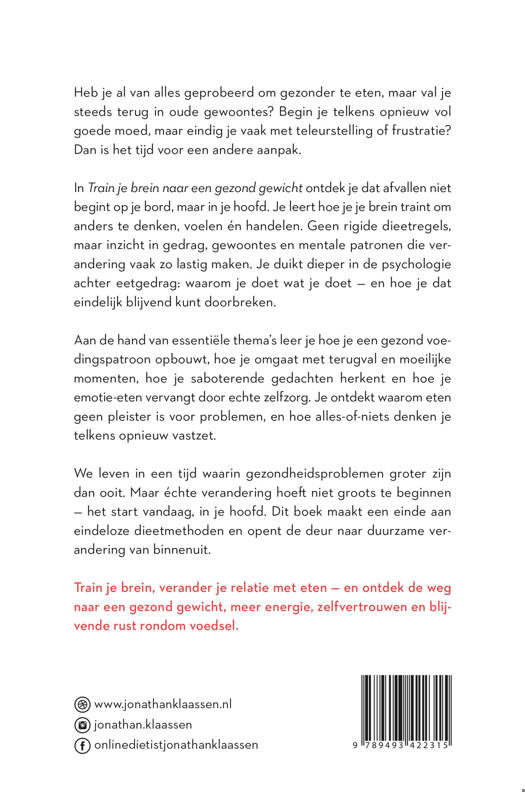 ‘Als iemand je kan helpen aan een gezonde relatie met eten, is het Jonathan. Gezond afvallen met gewoontes die bij jóu passen, zonder strikt dieet maar op een duurzame manier. Train je brein naar een gezond gewicht is daarbij het perfecte handboek.’ Brenda Kookt I www.brendakookt.nl
