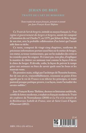 Ce Traite de l'art de bergerie, intitule en moyen francais Le Vray regime et gouvernement des bergers et bergeres, aurait ete compose a l'intention du roi Charles V, en 1379, par Jehan de Brie, berger de son etat, avec la probable collaboration d'un lettre qui l'aurait aide dans sa tache. Ce texte, compose de vingt-cinq chapitres, renferme de precieuses informations portant aussi bien sur le metier de berger, son statut, sa tenue vestimentaire, que sur les maladies des ovins et les remedes pour les soigner. Il n'omet pas, non plus, d'expliquer la maniere de chatrer ces animaux tout comme la facon d'elever le chien du berger. Il devoile, enfin, la facon de prevoir le temps grace aux animaux ou bien de savoir quels sont les bons et les mauvais vents. De premiere main, redige par l'archetype de l'honnete homme, fier de son art et, vraisemblablement, renomme au point d'etre appele par le roi de France a en edicter les principes, ce traite pastoral presque poetique prouve, a sa facon, toute l'actualite des savoirs oublies !