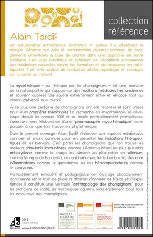 La mycothérapie (ou thérapie par les champignons) s'appuie sur des traditions médicales très anciennes et souvent oubliées. Elle s'avère extrêmement riche et efficace tant au niveau préventif que curatif. À ce jour, une centaine de champignons ont été recensés et sont utilisés pour leurs propriétés médicinales. La recherche en mycothérapie se développe depuis les années 2000 et se révèle particulièrement prometteuse, s'orientant vers l'élaboration d'une « pharmacopée mycothérapique ». Alain Tardif s'intéresse ici aux espèces médicinales connues et moins connues pour en présenter les indications thérapeutiques et les bienfaits. Particulièrement exhaustif et pédagogique, cet ouvrage abondamment documenté est le fruit de plusieurs dizaines d'années de travail et d'expériences. Il constitue une véritable « anthropologie des champignons » pour les praticiens de santé, les mycologues aguerris, mais également pour tous les amoureux des champignons.