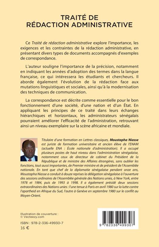 Ce Traité de rédaction administrative explore l'importance, les exigences et les contraintes de la rédaction administrative, en présentant divers types de documents accompagnés d'exemples de correspondance. L'auteur souligne l'importance de la précision, notamment en indiquant les années d'adoption des termes dans la langue française, ce qui intéressera les étudiants et chercheurs. Il aborde également l'évolution de la rédaction face aux mutations linguistiques et sociales, ainsi qu'à la modernisation des techniques de communication. La correspondance est décrite comme essentielle pour le bon fonctionnement d'une société, d'une nation et d'un État. En appliquant les principes de ce traité dans leurs échanges hiérarchiques et horizontaux, les administrateurs sénégalais pourraient améliorer l'efficacité de l'administration, retrouvant ainsi un niveau exemplaire sur la scène africaine et mondiale.