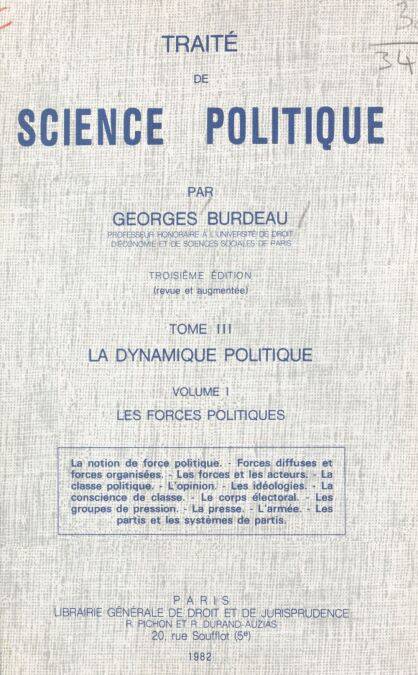 Après avoir abordé, dans les deux premières parties de son « Traité de science politique » le pouvoir et l’ État, Georges Burdeau (1905-1988), juriste français, spécialisé en science politique, aborde ici les questions de force politiques, diffuses ou organisées, de classe politique, de conscience de classe, de corps électoral, de groupes de pression, de partis, d’opinion, etc.