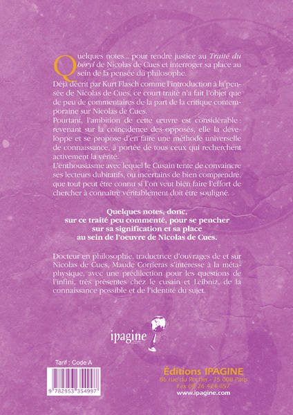 Maude Corrieras est Docteur en philosophie, traductrice d’ouvrages de et sur Nicolas de Cues, notamment le Traité du béryl Tome 1 (Ipagine, 2010) Elle s’intéresse à la métaphysique, avec une prédilection pour les questions de l’infini, très présentes chez le cusain et Leibniz, de la connaissance possible et de l’identité du sujet