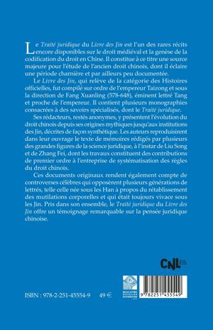 Le Livre des Jin, qui relève de la catégorie des Histoires officielles, fut compilé sur ordre de l’empereur Taizong et sous la direction de Fang Xuanling (578-648), éminent lettré Tang et proche de l’empereur. Il contient plusieurs monographies consacrées à des savoirs spécialisés, dont le Traité juridique. Ses rédacteurs, restés anonymes, y présentent l’évolution du droit chinois depuis ses origines mythiques jusqu’aux institutions des Jin, décrites de façon synthétique. Les auteurs reproduisirent dans leur ouvrage le texte de mémoires rédigés par plusieurs des grandes figures de la science juridique, à l’instar de Liu Song et de Zhang Fei, dont les travaux constituent des contributions de premier ordre à l’entreprise de systématisation des règles du droit chinois.