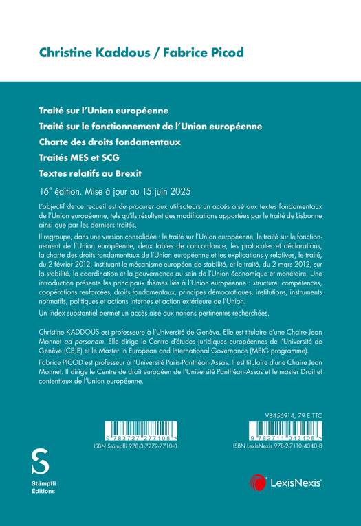 Il regroupe, dans une version consolidée, le traité sur l'Union européenne, le traité sur le fonctionnement de l'Union européenne, les protocoles et déclarations, la charte des droits fondamentaux de l'Union européenne et les explications y relatives, le traité, du 2 février 2012, instituant le mécanisme européen de stabilité, le traité, du 2 mars 2012, sur la stabilité, la coordination et la gouvernance au sein de l'Union économique et monétaire, et les principaux documents relatifs au Brexit, dont l'accord sur le retrait.