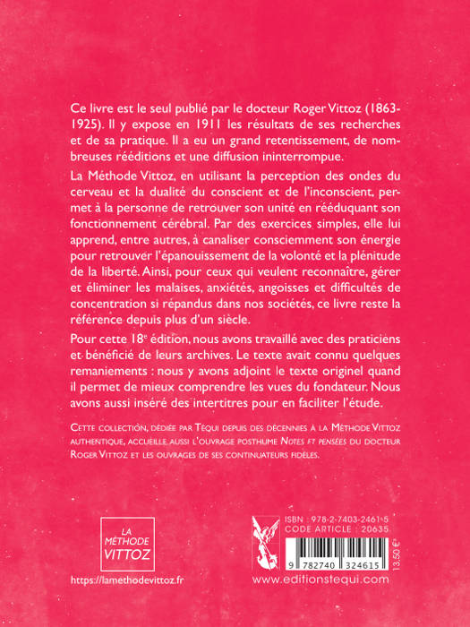 Le docteur Roger Vittoz (1863-1925) publiait en 1911, sous le titre Traitement des psychonévroses par la rééducation du contrôle cérébral, son premier et seul ouvrage dans lequel il exposait pour ses patients les résultats de ses recherches. La Méthode Vittoz, en utilisant la perception des ondes du cerveau et la dualité du conscient et de l'inconscient, rééduque la totalité de la personne par le contrôle cérébral. Ses exercices simples permettent, entre autres, de canaliser consciemment l'énergie pour retrouver l'épanouissement de la volonté et la plénitude de la liberté. Depuis plus d'un siècle, ce livre connaît une diffusion ininterrompue et reste la référence pour ceux qui veulent reconnaître, gérer et éliminer les malaises, anxiétés, angoisses, etc., si répandus actuellement.