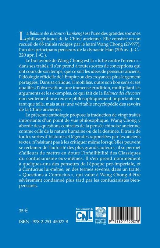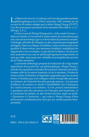 La Balance des discours (Lunheng) est l'une des grandes sommes philosophiques de la Chine ancienne. Elle consiste en un recueil de 85 traites rediges par le lettre Wang Chong (27-97?), l'un des principaux penseurs de la dynastie Han (206 av. J.-C.- 220 apr. J.-C.). Le but avoue de Wang Chong est la lutte contre l'erreur dans ses traites, il s'en prend a toutes sortes de conceptions qui ont cours de son temps, que ce soit les idees de penseurs anciens, l'ideologie officielle de l'Empire ou des croyances plus largement partagees. Dans sa critique, il mobilise, outre son bon sens et ses qualites d'observation, une immense erudition, multipliant les arguments et les exemples, ce qui fait de la Balance des discours non seulement une oeuvre philosophiquement importante en tant que telle, mais aussi une veritable encyclopedie des savoirs de la Chine ancienne. La presente anthologie propose la traduction de vingt traites importants d'un point de vue philosophique. Wang Chong y aborde des questions centrales de la pensee chinoise ancienne, comme celle de la nature humaine ou de la destinee. Il traite de toutes sortes d'histoires et legendes rapportees par les anciens textes, n'hesitant pas a les critiquer meme lorsqu'elles peuvent se reclamer de l'autorite des plus grands auteurs; il se permet d'ailleurs de mettre en doute l'infaillibilite des Classiques du confucianisme eux-memes. Il s'en prend nommement a quelques-uns des penseurs de l'epoque pre-imperiale, et a Confucius lui-meme, en des termes severes, dans un traite, Questions a Confucius , qui valut a Wang Chong d'etre severement condamne plus tard par les confucianistes bien-pensants.