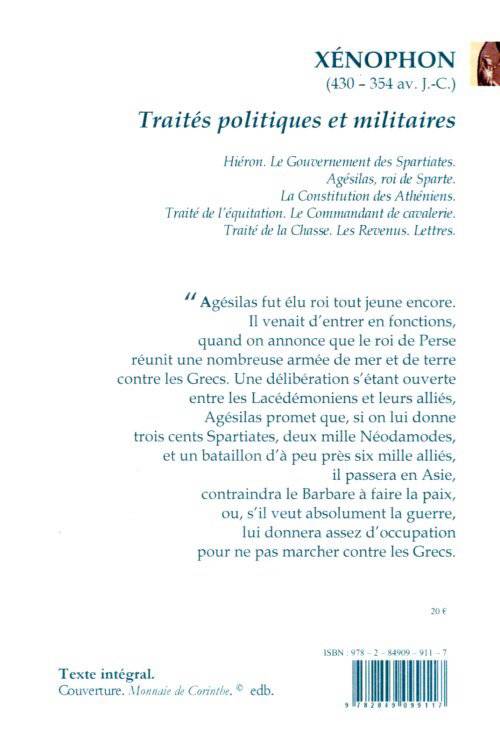 Le volume comprend : Hiéron ; Le Gouvernement des Spartiates ; Agésilas, roi de Sparte ; La Constitution des Athéniens ; Traité de l'équitation ; Le Commandant de cavalerie ; Traité de la chasse ; Les Revenus ; Lettres.