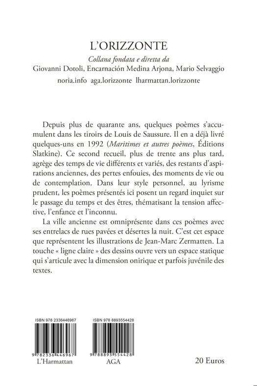 Depuis plus de quarante ans, quelques poèmes s’accumulent dans les tiroirs de Louis de Saussure. Il en a déjà livré quelques-uns en 1992 (Maritimes et autres poèmes, Éditions Slatkine). Ce second recueil, plus de trente ans plus tard, agrège des temps de vie différents et variés, des restants d’aspirations anciennes, des pertes enfouies, des moments de vie ou de contemplation. Dans leur style personnel, au lyrisme prudent, les poèmes présentés ici posent un regard inquiet sur le passage du temps et des êtres, thématisant la tension affective, l’enfance et l’inconnu. La ville ancienne est omniprésente dans ces poèmes avec ses entrelacs de rues pavées et désertes la nuit. C’est cet espace que représentent les illustrations de Jean-Marc Zermatten. La touche « ligne claire » des dessins ouvre vers un espace statique qui s’articule avec la dimension onirique et parfois juvénile des textes.