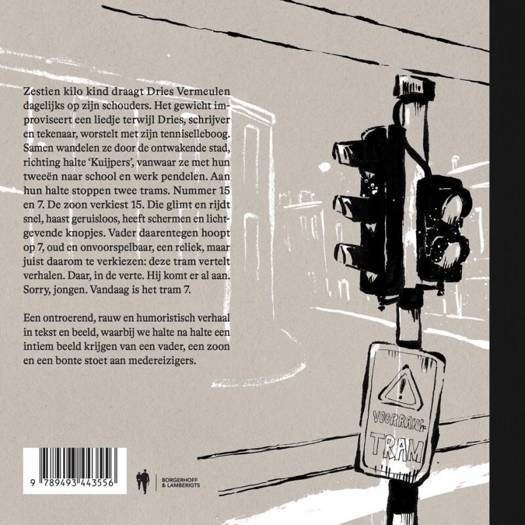 Zestien kilo kind draagt Dries Vermeulen dagelijks op zijn schouders. Het gewicht improviseert een liedje, terwijl Dries, schrijver en tekenaar, worstelt met zijn tenniselleboog. Samen wandelen ze door de ontwakende stad, richting halte ‘Kuijpers’, vanwaar ze met hun tweeën naar school en werk pendelen. Aan hun halte stoppen twee trams. Nummer 15 en 7. De zoon verkiest 15. Die glimt en rijdt snel, haast geruisloos, heeft schermen en lichtgevende knopjes. Vader daarentegen hoopt op 7, oud en onvoorspelbaar, een reliek, maar juist daarom te verkiezen: deze tram vertelt verhalen. Daar, in de verte. Hij komt er al aan. Sorry, jongen. Vandaag is het tram 7.