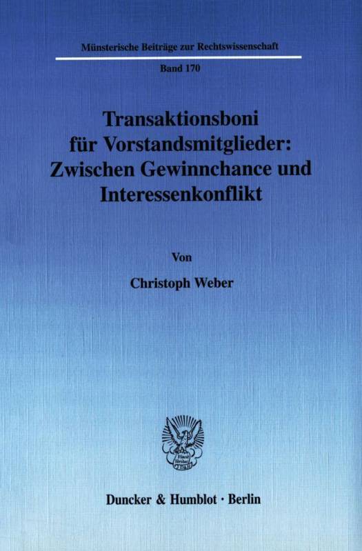 Zunächst ermittelt der Autor die ökonomische Funktion von Transaktionsboni als Modell zur Lösung von Interessenkonflikten in der Unternehmensübernahme. In den Blick werden dabei Tantiemen, Appreciation Awards, Abfindungen und Change of Control-Klauseln genommen. Im Anschluss daran wird die Stellung des Vorstands im Innenrecht der AG untersucht. Weber analysiert mit speziellem Bezug zur Übernahmesituation und zu transaktionsbezogenen Incentives, welchen Interessenbindungen das Leitungsorgan unterliegt. Auf dieser Grundlage beleuchtet er übernahmespezifische Verhaltenspflichten, organschaftliche Treuepflichten und Haftungsrisiken von incentivierten Vorstandsmitgliedern. Sodann werden transaktionsspezifische Angemessenheitskriterien im Rahmen des 87 AktG erörtert. Weber kritisiert die BGH-Rechtsprechung im Mannesmann-Verfahren. Er bejaht die grundsätzliche Zulässigkeit von Transaktionsboni seitens der Anteilseigner der Zielgesellschaft und definiert u. a. übernahmerechtliche Anforderungen an bieterseitige Sondervorteile. Abschließend wird aufgezeigt, unter welchen Voraussetzungen Pflichten zur Offenlegung transaktionsbezogener Incentives gegenüber den Aktionären der Zielgesellschaft bestehen.