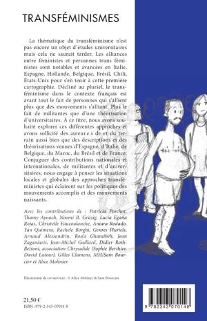 Décliné au pluriel, le transféminisme dans le contexte français est avant tout le fait de personnes qui s'allient plus que des mouvements s'alliant. Plus le fait de militantes que d'une théorisation d'universitaires. À ce titre, cet ouvrage explore ces différentes approches et sollicite des auteur.e.s de et du terrain aussi bien que des descriptions et des théorisations venues d'Espagne, d'Italie, de Belgique, du Maroc, du Brésil et de France.