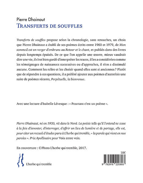 « Transferts de souffles » propose sans retouches, en suivant la chronologie, un choix que Pierre Dhainaut a établi de ses poèmes écrits entre 1960 et 1979, de « Mon sommeil est un verger d'embruns » au « Retour et le Chant », parus dans des livres depuis longtemps épuisés. De ce qu’on appelle une œuvre, mieux vaudrait dire : une vie, il s’est bien gardé d’interpréter les traces ; il les a considérées comme les témoignages de naissances successives ou d'approches, il n’en a dissimulé aucune. Comment les relire et les choisir quand elles sont si anciennes ? Plutôt que de répondre à ces questions, il a préféré ajouter aux poèmes d’autrefois une suite de poèmes récents, « Perpétuelle, la bienvenue ».