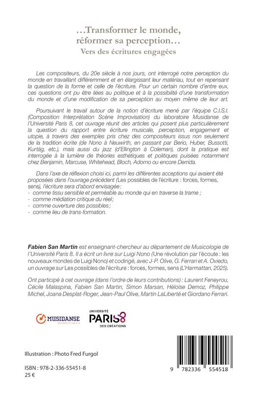 Les compositeurs, du 20e siècle à nos jours, ont interrogé notre perception du monde en travaillant différemment et en élargissant leur matériau, tout en repensant la question de la forme et celle de l'écriture. Pour un certain nombre d'entre eux, ces questions ont pu être liées au politique et à la possibilité d'une transformation du monde et d'une modification de sa perception au moyen même de leur art. Poursuivant le travail autour de la notion d'écriture mené par l'équipe C.I.S.I. (Composition Interprétation Scène Improvisation) du laboratoire Musidanse de l'Université Paris 8, cet ouvrage réunit des articles qui posent plus particulièrement la question du rapport entre écriture musicale, perception, engagement et utopie, à travers des exemples pris chez des compositeurs issus non seulement de la tradition écrite (de Nono à Neuwirth, en passant par Berio, Huber, Bussotti, Kurtág, etc.), mais aussi du jazz (d'Ellington à Coleman), dont la pratique est interrogée à la lumière de théories esthétiques et politiques puisées notamment chez Benjamin, Marcuse, Whitehead, Bloch, Adorno ou encore Derrida. Dans l'axe de réflexion choisi ici, parmi les différentes acceptions qui avaient été proposées dans l'ouvrage précédent (Les possibles de l'écriture: forces, formes, sens), l'écriture sera d'abord envisagée: - comme tissu sensible et perméable au monde qui en traverse la trame; - comme médiation critique du réel; - comme ouverture des possibles; - comme lieu de trans-formation.