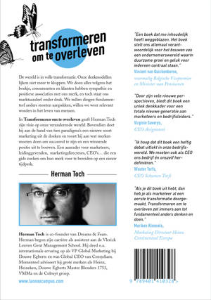 Nieuwe denkmodellen voor marketing en management De wereld is in volle transformatie. Onze denkmodellen lijken niet meer te kloppen. We doen alles volgens het boekje, consumenten en klanten hebben sympathie en positieve associaties met ons merk, en toch staat ons marktaandeel onder druk. We zullen dingen fundamenteel anders moeten aanpakken, willen we weer relevant worden in het leven van mensen. In Transformeren om te overleven geeft Herman Toch zijn visie op onze veranderende wereld. Bovendien doet hij aan de hand van tien paradigma's een nieuwe soort marketing uit de doeken en toont hij aan wat merken moeten doen om succesvol te zijn en een winnende positie uit te bouwen. Een aanrader voor marketeers, leidinggevenden, marketingdirecteurs, CEO's die een gids zoeken om hun merk voor te bereiden op een nieuw tijdperk.