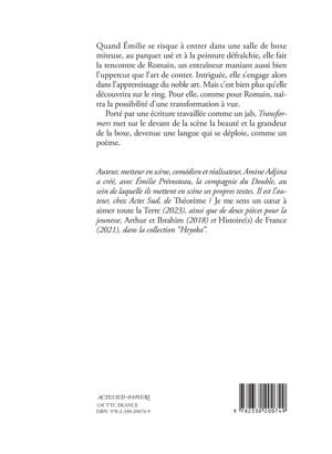 Quand Émilie se risque à entrer dans une salle de boxe miteuse, au parquet usé et à la peinture défraîchie, elle fait la rencontre de Romain, un entraîneur maniant aussi bien l'uppercut que l'art de conter. Intriguée, elle s'engage alors dans l'apprentissage du noble art. Mais c'est bien plus qu'elle découvrira sur le ring. Pour elle, comme pour Romain, naîtra la possibilité d'une transformation à vue. Porté par une écriture travaillée comme un jab, Transformers met sur le devant de la scène la beauté et la grandeur de la boxe, devenue une langue qui se déploie, comme un poème.