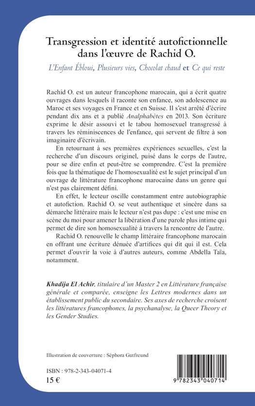 Rachid O., auteur marocain francophone, exprime par son écriture le désir assouvi et le tabou homosexuel transgressé à travers les réminiscences de l'enfance, qui servent de filtre à son imaginaire d'écrivain. Rachid O. renouvelle le champ littéraire marocain en offrant une écriture dénuée d'artifice qui dit qui il est.
