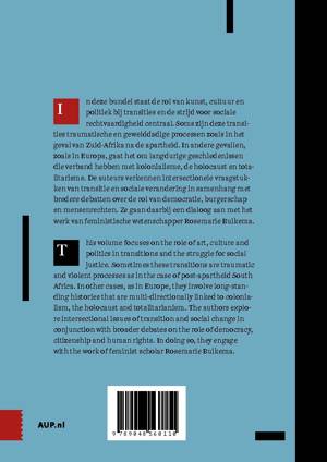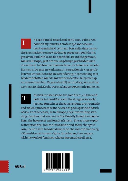 In deze bundel staat de rol van kunst, cultuur en politiek bij transities en de strijd voor sociale rechtvaardigheid centraal. Soms zijn deze transities traumatische en gewelddadige processen zoals in het geval van Zuid-Afrika na de apartheid. In andere gevallen, zoals in Europa, gaat het om langdurige geschiedenissen die verband hebben met kolonialisme, de holocaust en totalitarisme. De auteurs verkennen intersectionele vraagstukken van transitie en sociale verandering in samenhang met bredere debatten over de rol van democratie, burgerschap en mensenrechten. Ze gaan daarbij een dialoog aan met het werk van feministische wetenschapper Rosemarie Buikema.