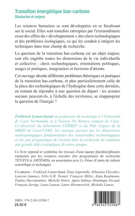 Les sciences humaines se sont développées en se focalisant sur le social. Elles sont toutefois rattrapées par l’extraordinaire essor des effets du « développement », des choix technologiques et des problèmes écologiques, ce qui les conduit à intégrer les techniques dans leur champ de recherche. La question de la transition bas-carbone est un objet majeur, tant elle englobe toutes les dimensions de la vie individuelle et collective : choix technologiques, orientations politiques, usages et pratiques, imaginaires et horizons d’attente. Cet ouvrage aborde différents problèmes théoriques et pratiques de la transition bas-carbone, et plus particulièrement celle de la place des technologiques de l’hydrogène dans cette dernière, en tentant de répondre à une question de départ : les acteurs sociaux peuvent-ils, à l’échelle des territoires, se réapproprier la question de l’énergie ?