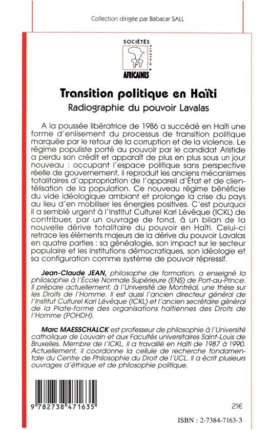 A la poussée libératrice de 1986 a succédé en Haïti une forme d'enlisement du processus de transition politique marquée par le retour de la corruption et de la violence. Le régime populiste porté au pouvoir par le candidat Aristide a perdu son crédit et apparaît de plus en plus sous un jour nouveau : occupant l'espace politique sans perspective réelle de gouvernement, il reproduit les anciens mécanismes totalitaires d'appropriation de l'appareil d'Etat et de clientélisation de la population. Ce nouveau régime bénéficie du vide idéologique ambiant et prolonge la crise du pays au lieu d'en mobiliser les énergies positives. C'est pourquoi il a semblé urgent à l'Institut Culturel Karl Lévêque (ICKL) de contribuer, par un ouvrage de fond, à un bilan de la nouvelle dérive totalitaire du pouvoir en Haïti. Celui-ci retrace les éléments majeurs de la dérive du pouvoir Lavalas en quatre parties : sa généalogie, son impact sur le secteur populaire et les institutions démocratiques, son idéologie et sa configuration comme système de pouvoir répressif.