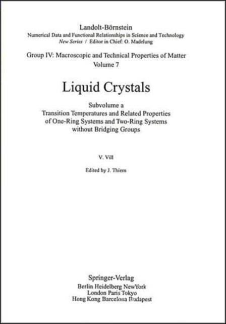 Volume IV/7 Liquid Crystals is devoted to critically selected and assessed fundamental data, mainly transition temperatures, which characterize the existing liquid crystalline phases and states of a large number of compounds. All relevant references including the very important patent literature and data (1850-1994) were collected in the data base LIQCRYST, from which the present Volume IV/7 has been derived by an individual critical choice of compounds, references and data. The printed tables offer an overall picture of the liquid crystalline field. Furthermore the comparison of corresponding data and perhaps the elucidation of structure-function relationships is facilitated, whereas the data base allows a facile access to any substructure and property search.