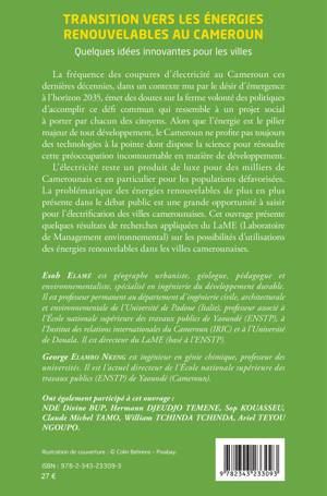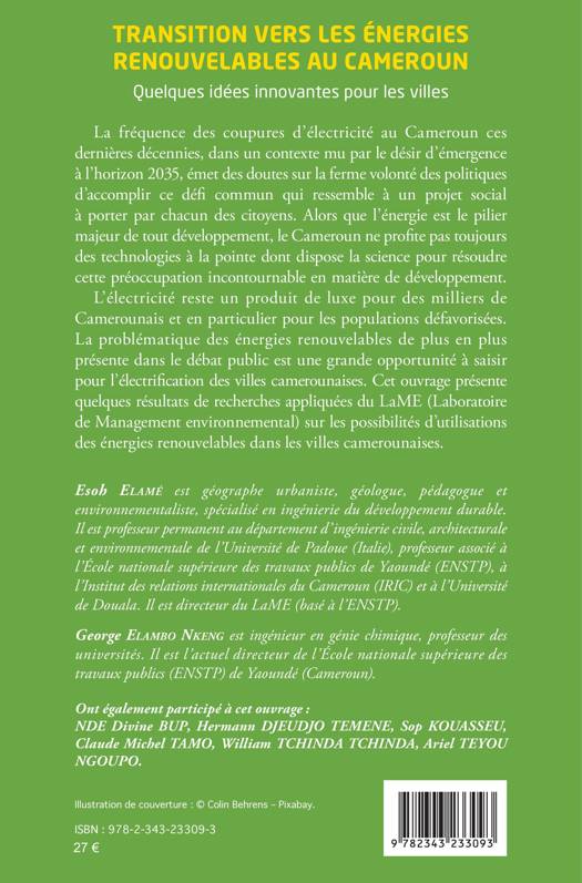 La fréquence des coupures d’électricité au Cameroun ces dernières décennies, dans un contexte mu par le désir d’émergence à l’horizon 2035, émet des doutes sur la ferme volonté des politiques d’accomplir ce défi commun qui ressemble à un projet social à porter par chacun des citoyens. Alors que l’énergie est le pilier majeur de tout développement, le Cameroun ne profite pas toujours des technologies à la pointe dont dispose la science pour résoudre cette préoccupation incontournable en matière de développement. L’électricité reste un produit de luxe pour des milliers de Camerounais et en particulier pour les populations défavorisées. La problématique des énergies renouvelables de plus en plus présente dans le débat public est une grande opportunité à saisir pour l’électrification des villes camerounaises. Cet ouvrage présente quelques résultats de recherches appliquées du LaME (Laboratoire de Management environnemental) sur les possibilités d’utilisations des énergies renouvelables dans les villes camerounaises.