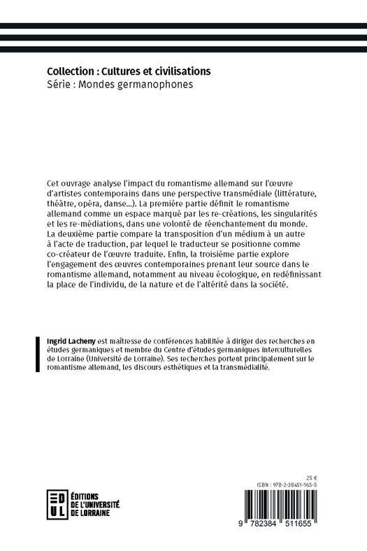 Cet ouvrage analyse l'impact du romantisme allemand sur l'œuvre d'artistes contemporains dans une perspective transmédiale (littérature, théâtre, opéra, danse…). La première partie définit le romantisme allemand comme un espace marqué par les re-créations, les singularités et les re-médiations, dans une volonté de réenchantement du monde. La deuxième partie compare la transposition d'un médium à un autre à l'acte de traduction, par lequel le traducteur se positionne comme co-créateur de l'œuvre traduite. Enfin, la troisième partie explore l'engagement des oeuvres contemporaines prenant leur source dans le romantisme allemand, notamment au niveau écologique, en redéfinissant la place de l'individu, de la nature et de l'altérité dans la société.